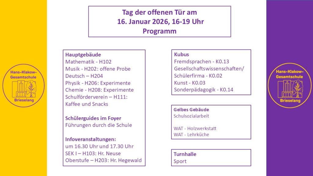 Am 16.1.26 findet der Tag der offenen Tür statt. Wir laden Sie herzlichst ein, sich ein Bild von unserer Schule, unseren Angeboten und Inhalten zu machen. Gucken Sie einfach rein und/oder kommen Sie mit den SchülerInnen und LehrerInnen ins Gespräch. Wir freuen uns auf Sie.